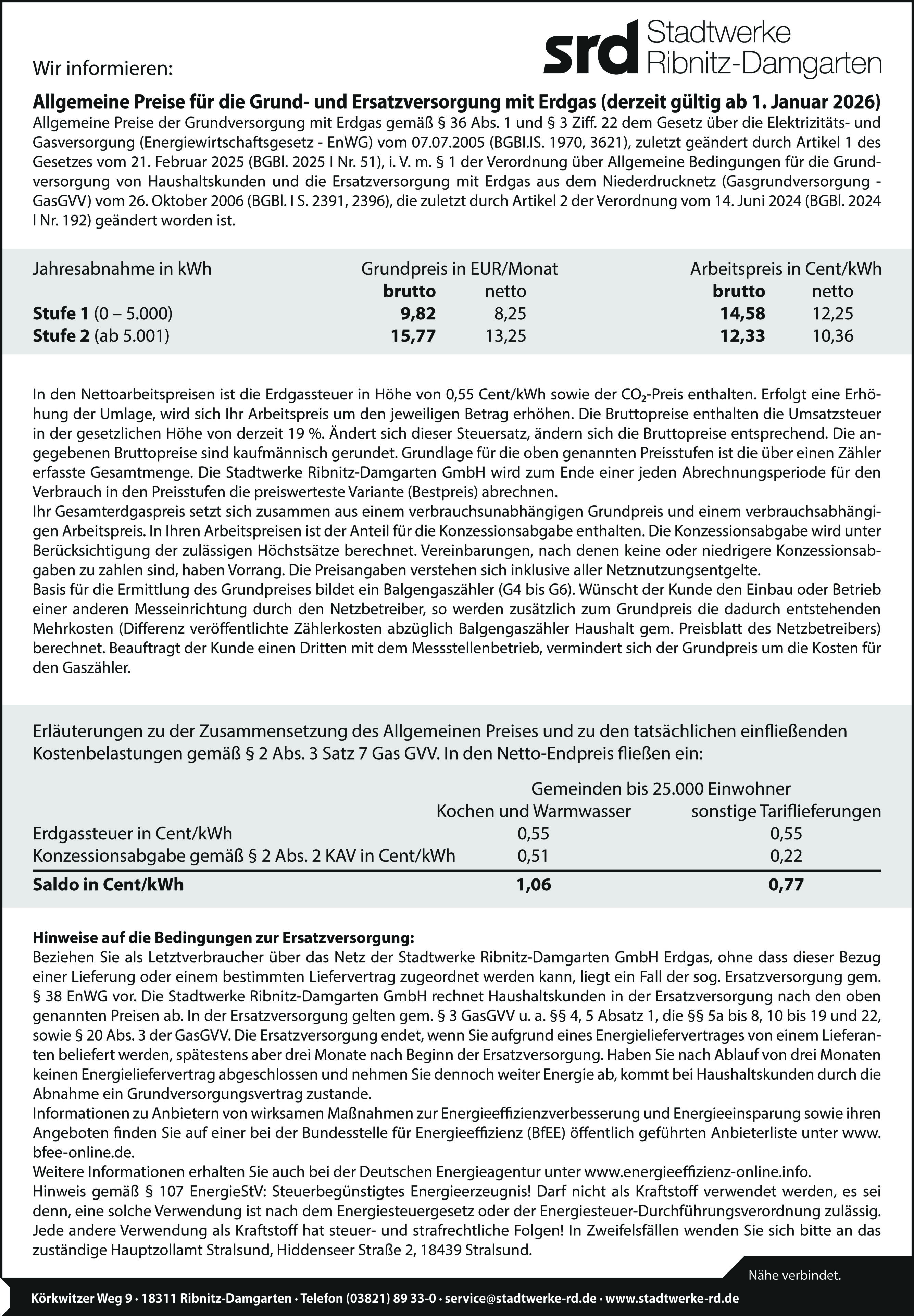 Die Stadtwerke Ribnitz-Damgarten sind verantwortlich für die Grundversorgung mit Erdgas im Netzgebiet der Stadtwerke Ribnitz-Damgarten GmbH. Diese erfolgt auf Basis der Gasgrundversorgungsverordnung (GasGVV) und des aktuellen Preisblattes (gültig ab 01.01.2025).