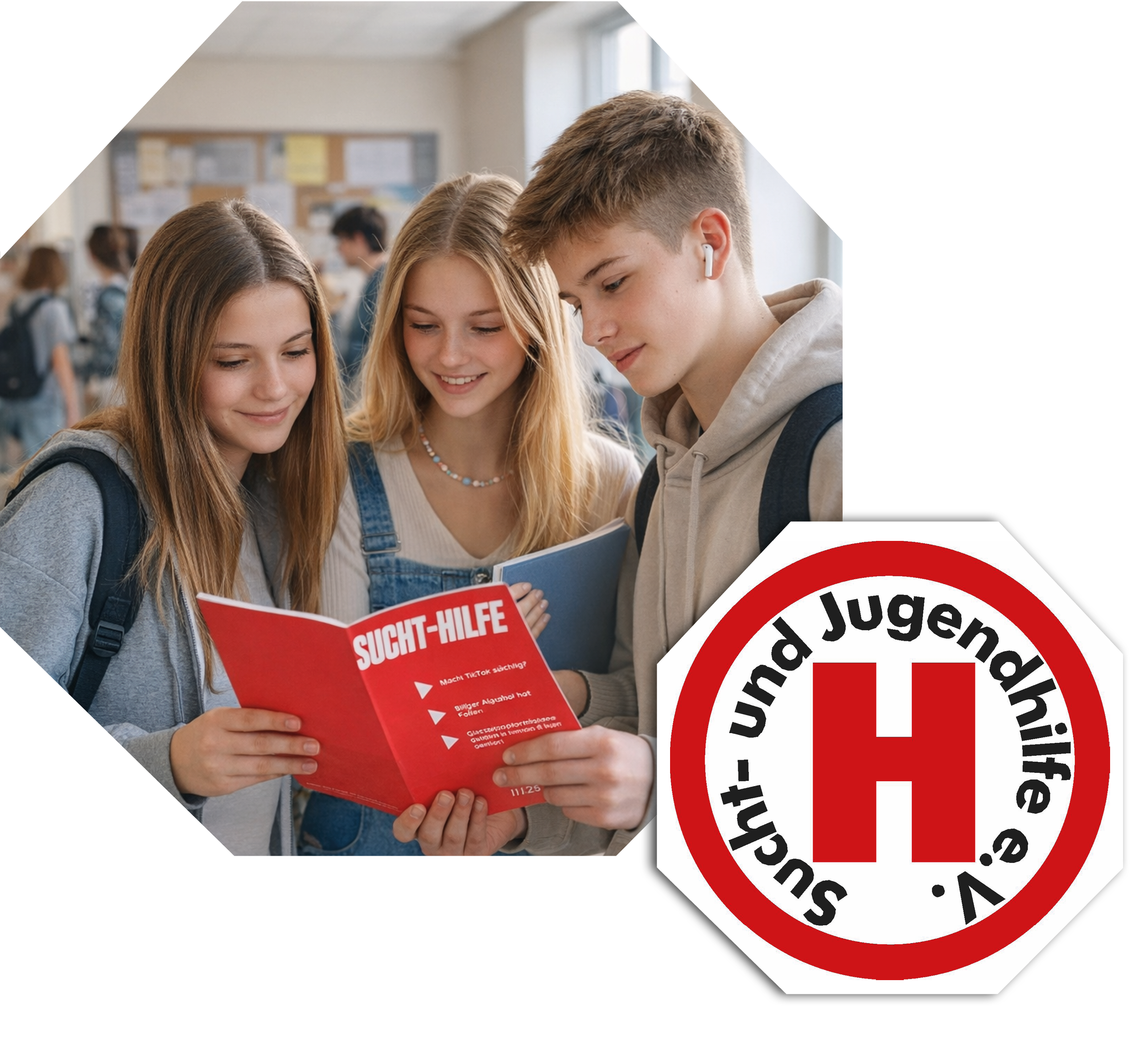 Bild zeigt drei Jugendliche, die in den Ratgeber der Sucht- und Jugendhilfe reinschauen. Zudem das runde Logo der Sucht- und Jugendhilfe in Rot und Schwarz.