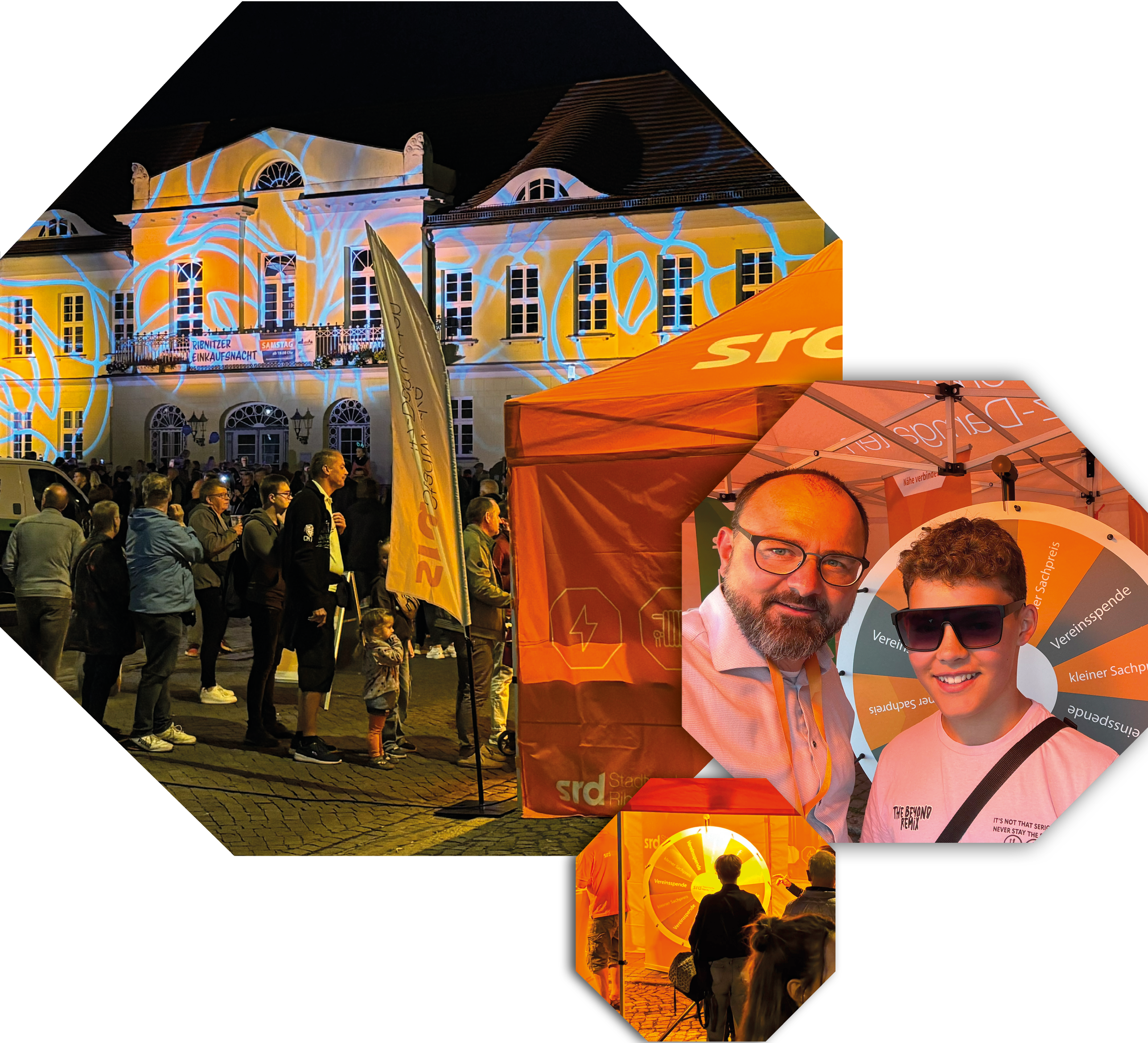 3 Bilder von der Ribnitzer Einkaufsnacht, mit Glücksrad und dem orangen Pavillion der Stadtwerke Ribnitz-Damgarten.