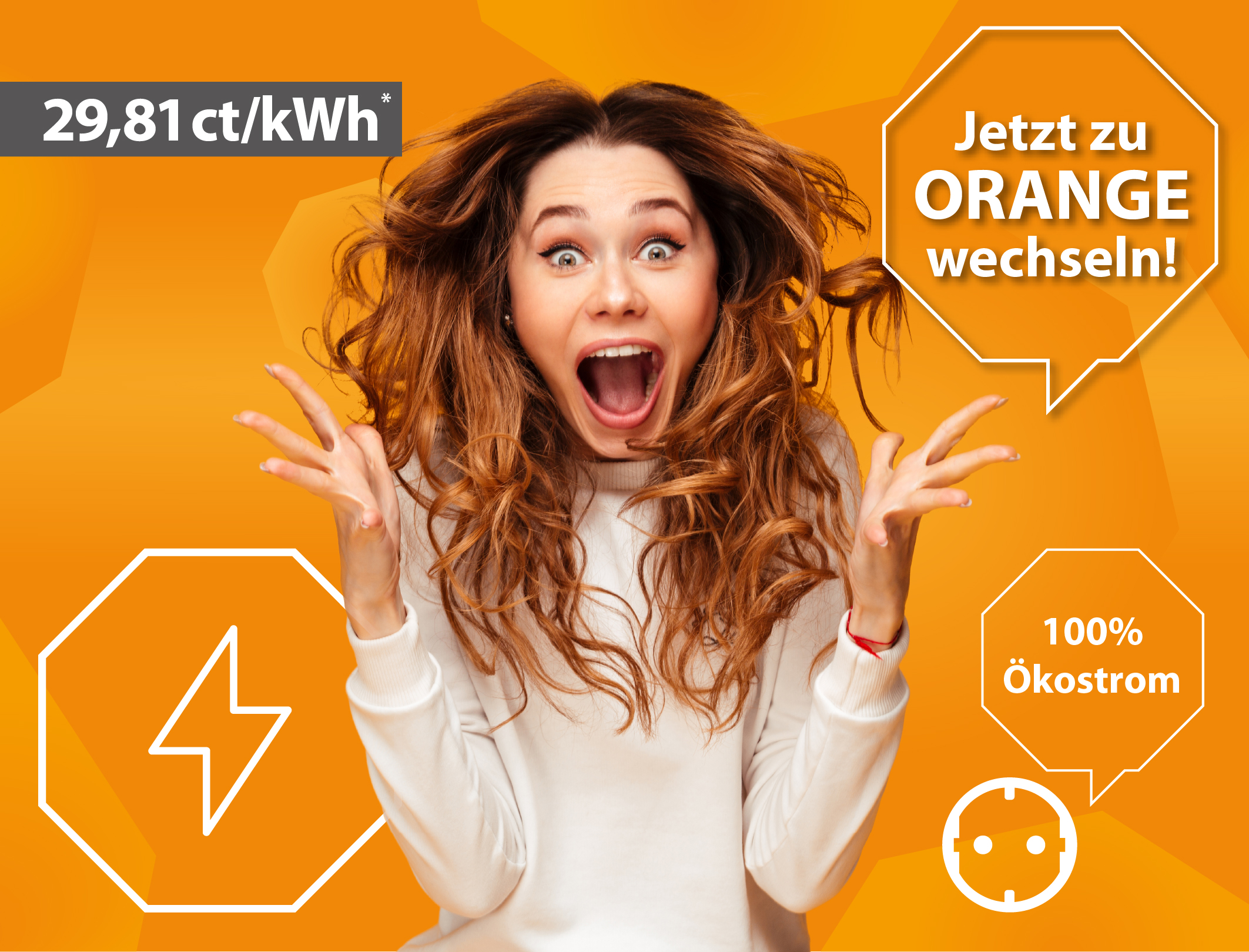 Bernsteinstrom-Werbe-Bild mit der Aufschrift: Jetzt zu Orange wechseln! 29,81 ct pro Kilowattstunde.